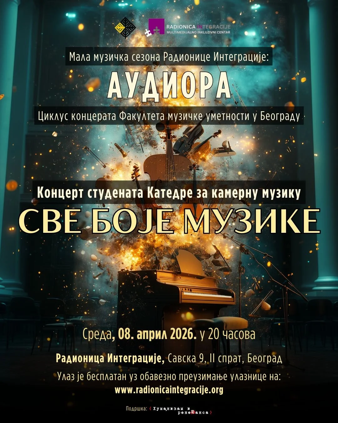 U nastavku ciklusa AUDIORA biće održan koncert studenata Katedre za kamernu muziku ovog fakulteta pod nazivom Sve boje muzike u sredu, 8. aprila u 20 časova u sali Radionice integracije