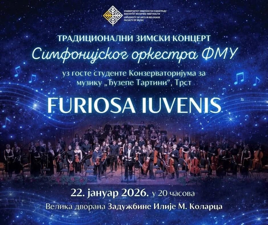 Tradicionalni zimski koncert Simfonijskog orkestra Fakulteta muzičke umetnosti pod nazivom Furiosa Iuvenis biće održan 22. januara od 20 časova u Velikoj sali Kolarčeve zadužbine.