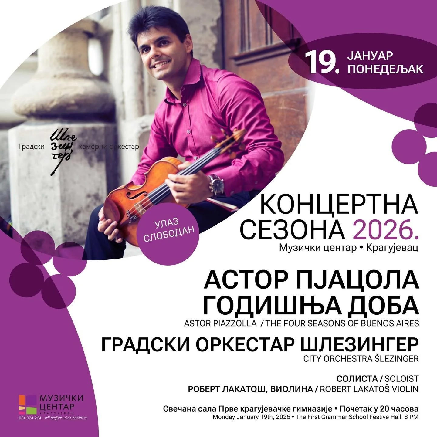 Muzički centar Kragujevac saopštio je da novu koncertu sezonu koja će se realizovati tokom 2026. godine otvara sa izuzetnim solistom, violinistiom Robertom Lakatošem.