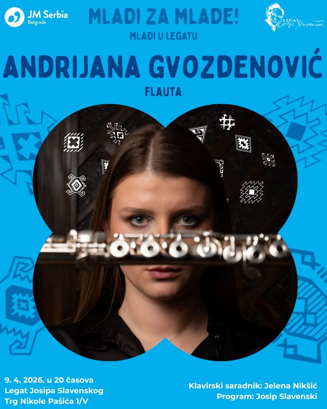 Mlada flautiskinja, Andrijana Gvozdenović, održaće koncert u okviru ciklusa koncerata Mladi za mlade Muzičke omladine Beograd u četvrtak 9. aprila u 20 časova u Legatu Slavenski.