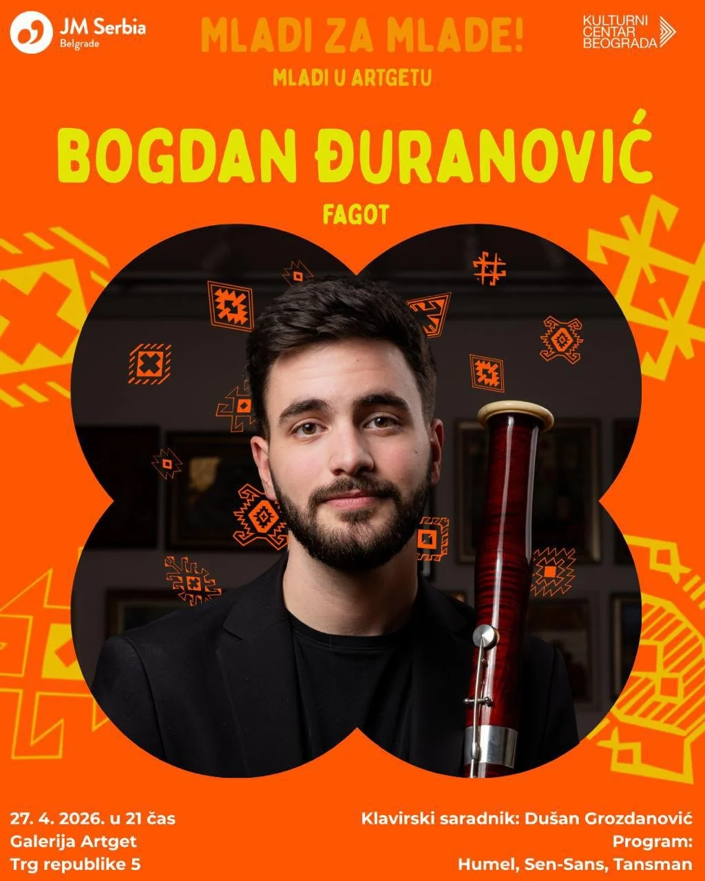 Mladi fagotista, Bogdan Đuranović, održaće koncert u okviru ciklusa koncerata Mladi za mlade Muzičke omladine Beograd u ponedeljak 27. aprila u 21 čas u Galeriji Artget. Klavirski saradnik biće pijanista Dušan Grozdanović.