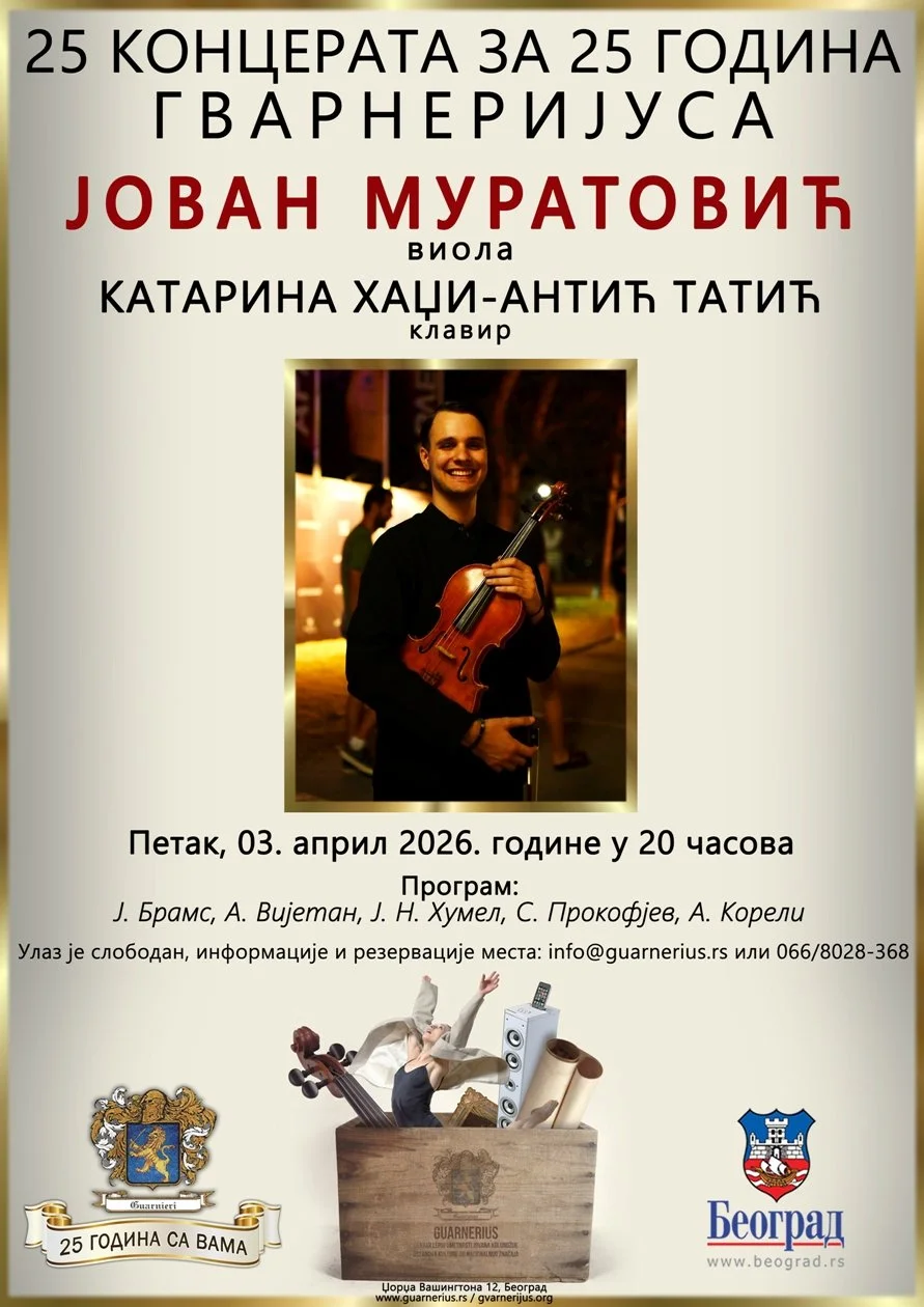 Višestruko nagrađivani mladi umetnik, jedan od najperspektivnijih violista svoje generacije – Jovan Muratović, nastupiće uz klavirsku saradnju istaknute pijanistkinje Katarine Hadži-Antić Tatić, navodi se u saopštenju Gvarnerijusa.