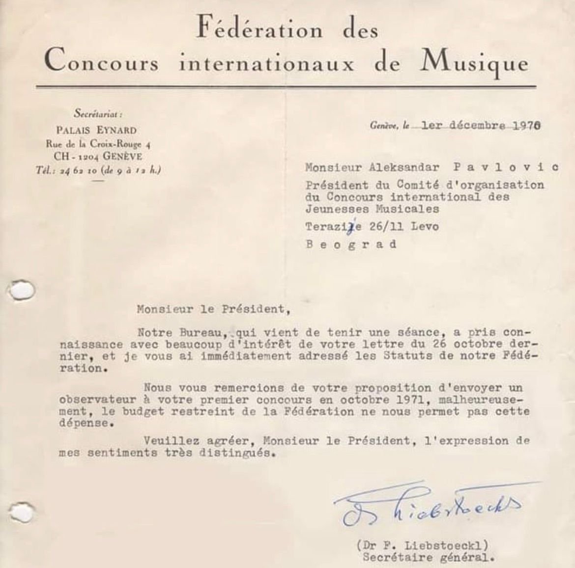 Kao dopunu saopštenja, Muzička omladina Beograda priložila je i dokument kojim se prikazuju početni pregovori Muzičke omladine Beograda, odnosno Aleksandra Pavlovića sa Svetskom federacijom u Ženevi.