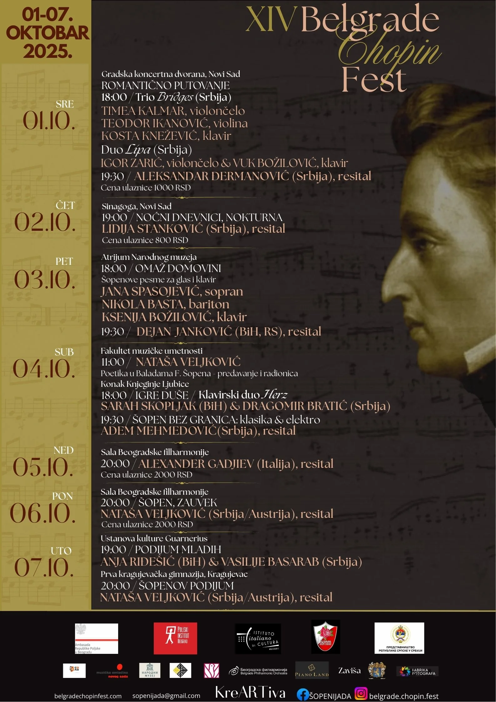 Ovogodišnji, 14. po redu Beogradski Šopen fest, biće održan od 1. do 7. oktobra u Novom Sadu, Kragujevcu i Beogradu. Publiku očekuje vrlo ispunjen, dinamičan i bogat program koji će predstaviti Šopena i izvan okvira čiste klavirske muzike koju je najviše komponovao.
