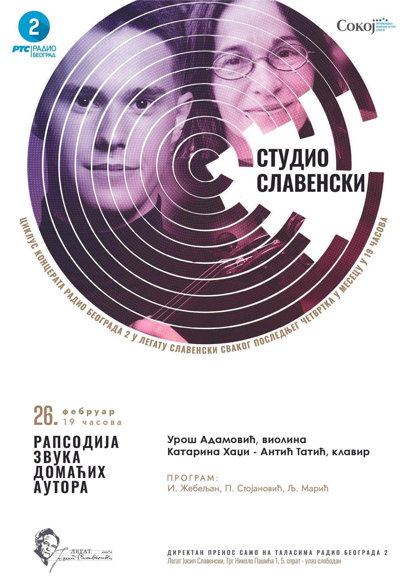 Druga sezona ciklusa koncerata Studio Slavenski koja je otpočela u septembru 2025. godine nastavlja se svakog poslednjeg četvrtka u mesecu u Legatu Josipa Slavenskog uz direktan prenos na talasima Radio Beograda 2.