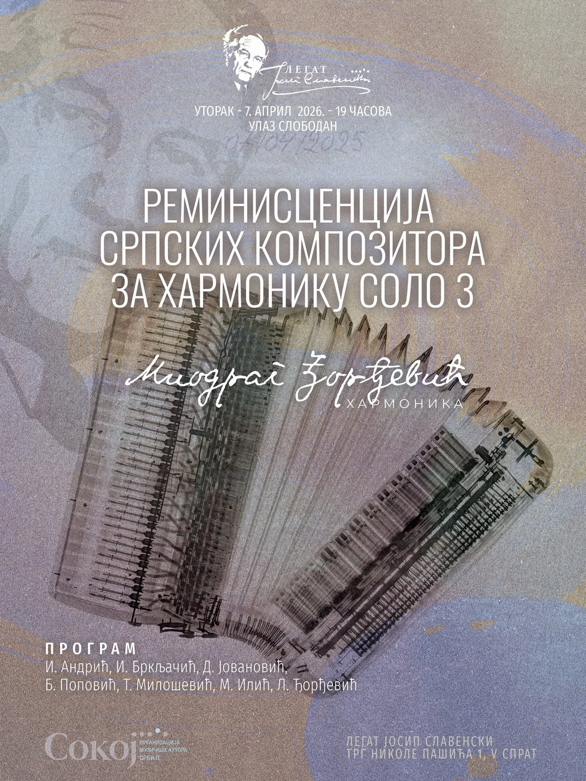 Koncert pod nazivom Reminiscencija dela srpskih kompozitora za harmoniku solo 3 izvešće Miodrag Đorđević na harmonici u utorak, 7. aprila u Legatu Slavenski sa početkom u 19 časova.