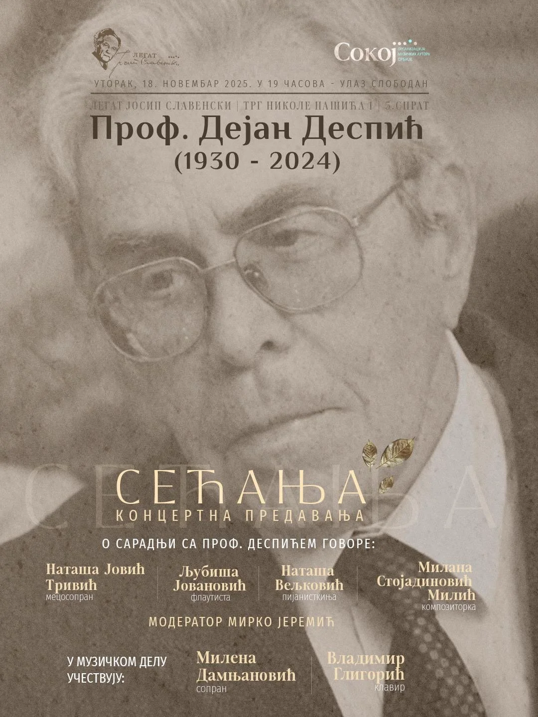 U utorak, 18. novembra, od 19 časova, u Legatu Josipa Slavenskog biće održano koncertno predavanje u okviru projekta Sećanja, posvećeno akademiku, kompozitoru i profesoru Dejanu Despiću.