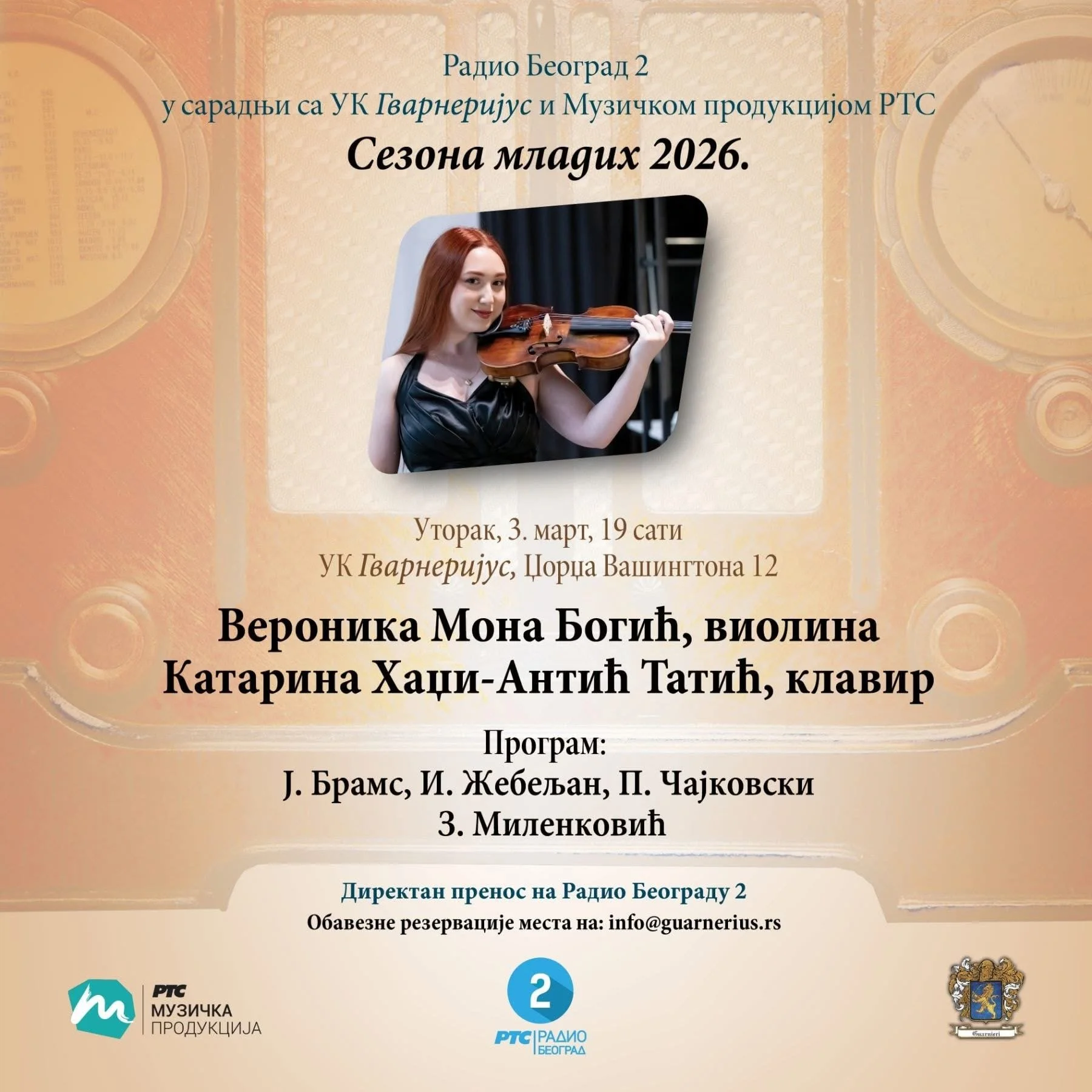 Četvrti ciklus koncerata Sezona mladih 2026 nastavlja se koncertom violinistkinje Veronike Mone Bogić i pijanistkinje Katarine Hadži-Antić Tatić u utorak, 3. marta od 19 časova u Ustanovi kulture Gvarnerijus.