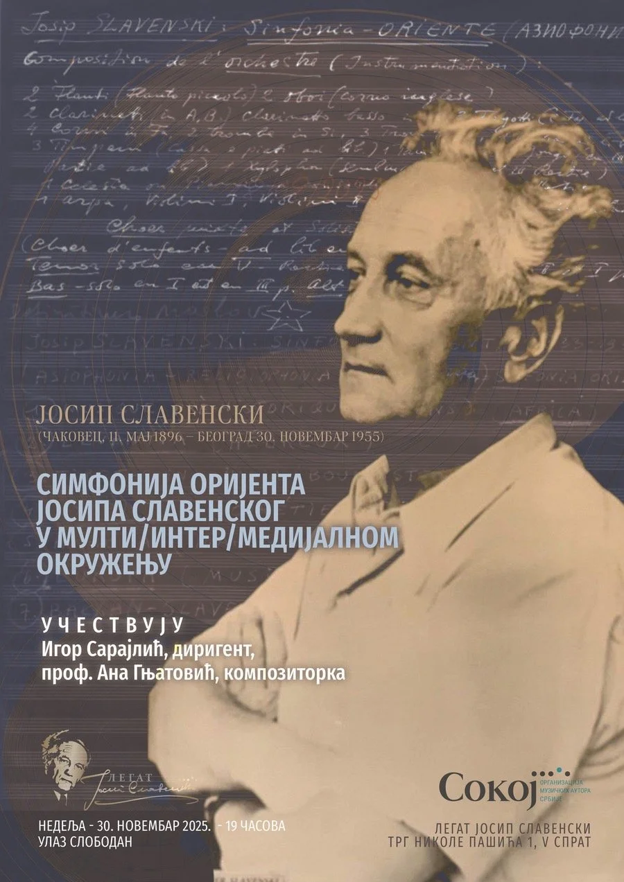 U Legatu Josipa Slavenskog će u nedelju, 30. novembra od 19 časova, biti održana prezentacija pod nazivom Simfonija Orijenta Josipa Slavenskog u multi/inter/medijalnom okruženju.
